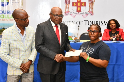 Minister of Tourism, Hon. Edmund Bartlett (centre), presents a voucher valued at $100,000 to Pastry Chef at Catalonia Montego Bay, Lanaysha McPherson, during the official launch of the Tourism Housing Assistance & Recovery Programme (THARP) on Tuesday (December 16), at The Jamaica Pegasus hotel in New Kingston. Sharing in the moment is President, Jamaica Hotel and Tourist Association (JHTA), Christopher Jarrett.