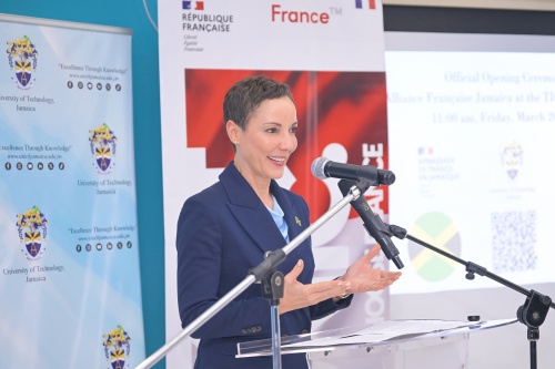 Minister of Foreign Affairs and Foreign Trade, Senator the Hon. Kamina Johnson Smith, addresses the official opening of Alliance Française de la Jamaïque’s new location at the Technology Innovation Centre (TIC) on the University of Technology (UTech) campus in Papine, St. Andrew on March 20.