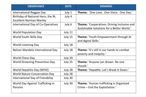 The Jamaica Information Service has prepared the following list of some important national and international observances which are expected to take place during the month of July 2025.
