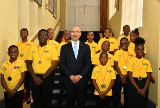 Governor-General, His Excellency the Most Hon. Sir Patrick Allen (third right), is surrounded by the new executive team of the Jamaica Employers’ Federation, led by President Wayne Chen (third left), during a courtesy call at King’s House on February 8.