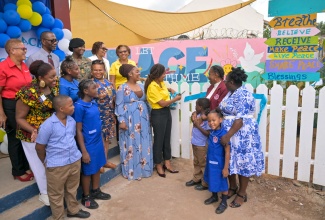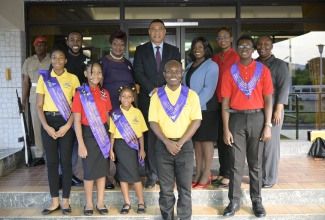 Prime Minister, the Most Hon. Andrew Holness (second row, third left), shares a photo opportunity with winners of the 2024 National Reading Competition and officials of the Jamaica Library Service (JLS) during a recent courtesy call at the Office of the Prime Minister. The winners are (front row from left) Fantasia Edwards (15-20 age group); Yendi Burke (9-11 age group);...
