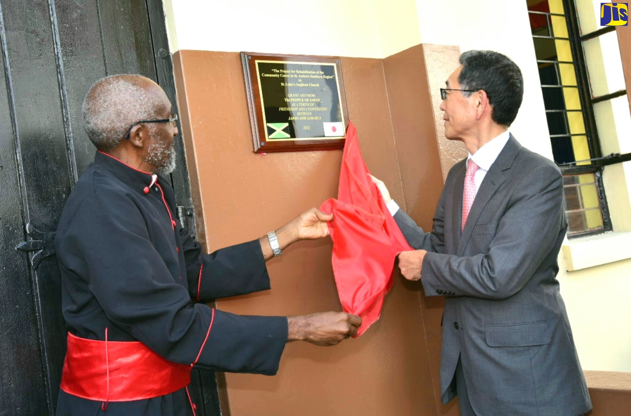 Ambassador of Japan to Jamaica, His Excellency Masaya Fujiwara (right), and Rector of St. Luke’s Anglican Church in Crossroads, Archdeacon Patrick Cunningham, unveil a plaque to dedicate a rehabilitated community hall/enrichment centre, which was officially handed over to the St. Andrew South community on December 2. The work was undertaken through Japan’s Grant Assistance for Grass-Roots Human Security Project (GGP)...