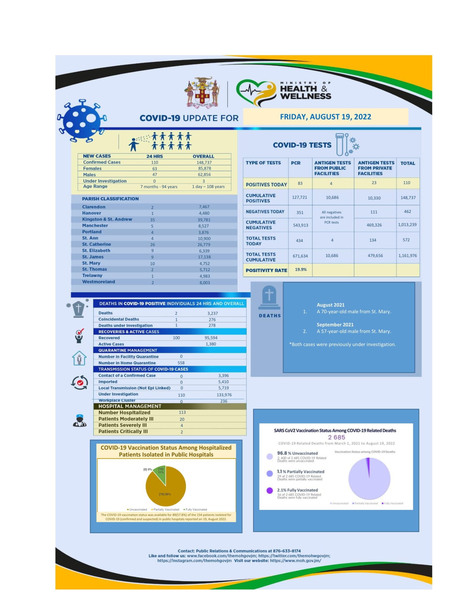 COVID-19 Clinical Management Summary for Friday August 19, 2022 By: Ministry of Health and Wellness, August 20, 2022 Listen Coronavirus Share Photo: Stock ImageStock Image The Full Story