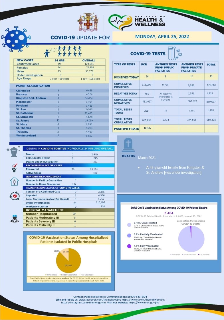COVID-19 Clinical Management Summary for Monday, April 25, 2022 By: Ministry of Health and Wellness, April 26, 2022 Listen Coronavirus Share Photo: Stock ImageStock Image The Full Story