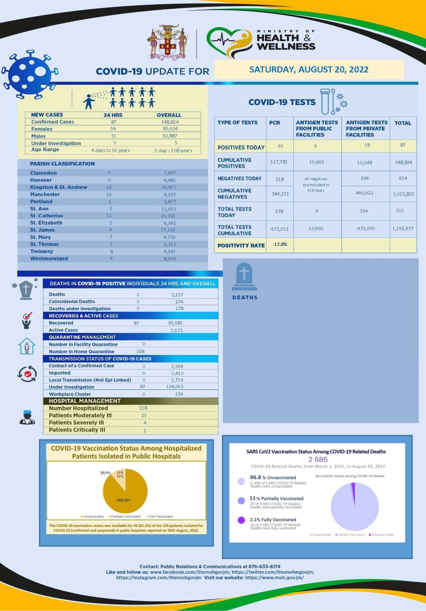COVID-19 Clinical Management Summary for Saturday August 20, 2022 By: Ministry of Health and Wellness, August 21, 2022 Listen Coronavirus Share Photo: Stock ImageStock Image The Full Story