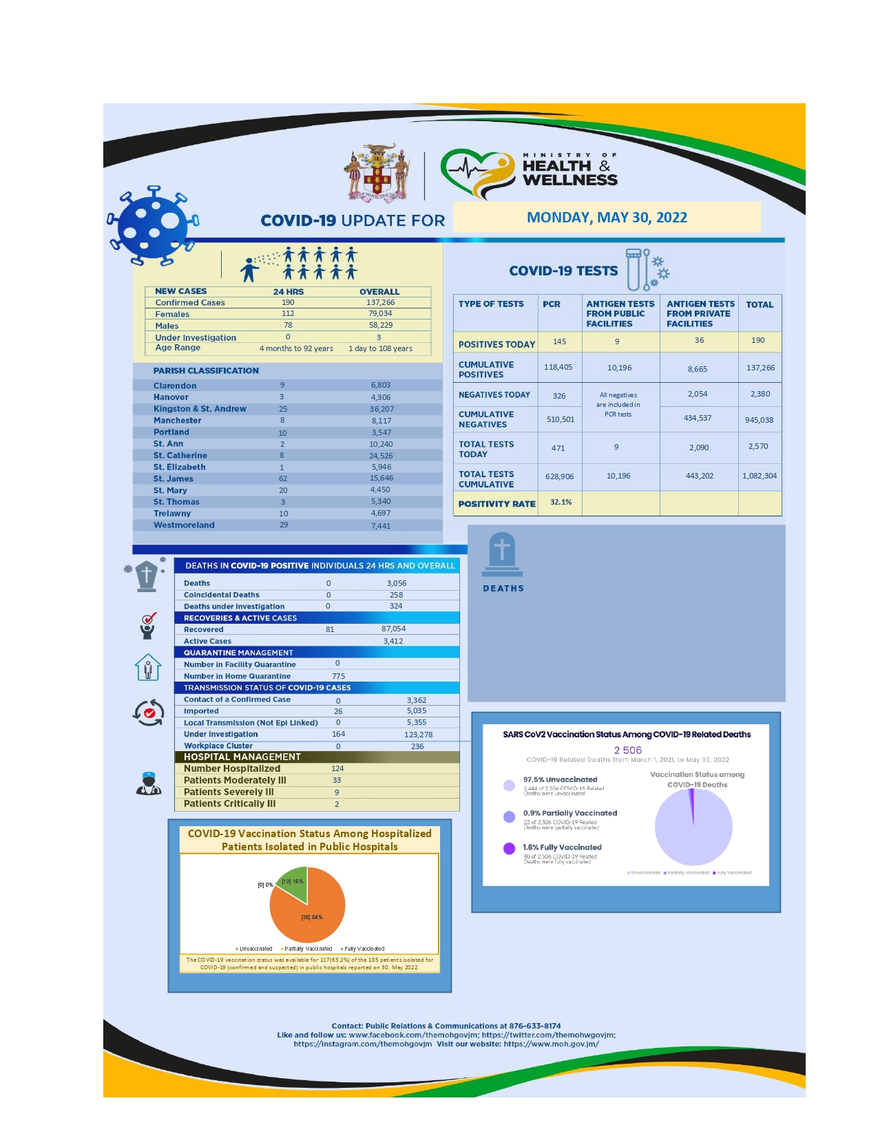 COVID-19 Clinical Management Summary for Monday, May 30, 2022 By: Ministry of Health and Wellness, May 31, 2022 Listen Coronavirus Share Photo: Stock ImageStock Image The Full Story