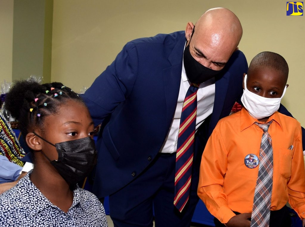 Commissioner of Police, Major General Anthony Anderson (centre), engages with Aaliyah (left) and Gerrard McFarlane, children of the late police constable, Gerrard McFarlane. Occasion was a luncheon to honour fallen officers, held at the Office of the Commissioner in St. Andrew on Tuesday (November 23).