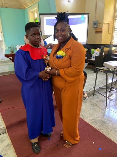 Top Male Student at the Birnamwood Primary School in Portland, Talique Counlson (left), receives his trophy from teacher at the school, Anny-K Lafayette, during the institution’s recent graduation ceremony, held at the St. James Anglican Church in the parish.