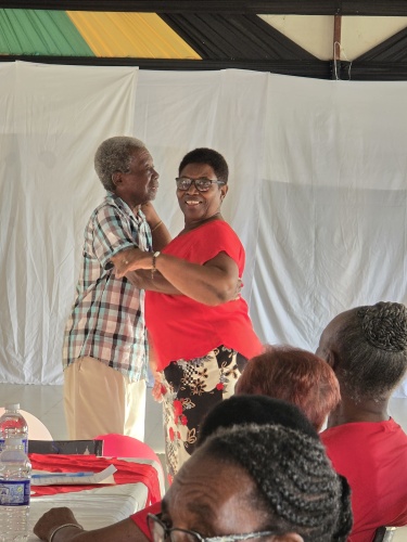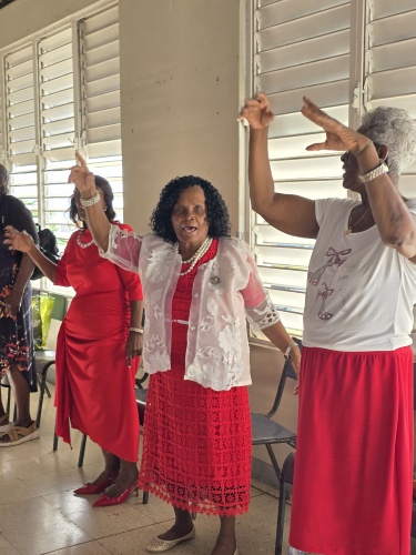 Donned in various red and white outfits, senior citizens from the Eastern parish spent the afternoon inside the Anglican Church Hall indulging in culinary treats, participating in impromptu performances and spreading love.
