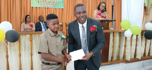 Principal of St. Paul’s Primary and Infant School in Manchester, Garfre Robinson (right), makes a presentation to Top Male student, Dontae Johnson, at the school’s recent graduation ceremony held at Providence Gospel Hall Church in the parish.