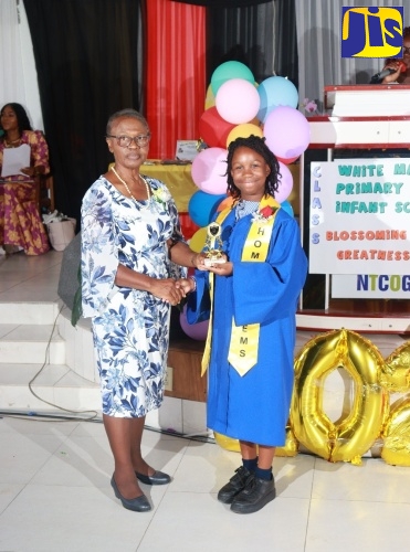 Top Student at the White Marl Primary and Infant School in St. Catherine, Shanoya Wright (right), receives her trophy from Chairman of the school, Sylvia Bryan, at the institution’s recent graduation ceremony, held at the New Testament Church of God in the community.