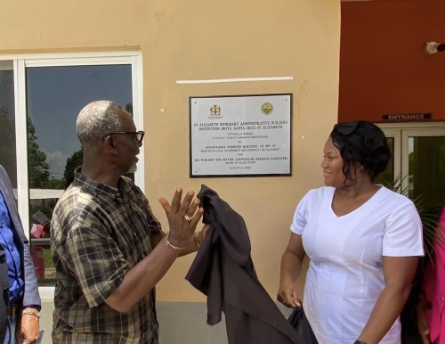 Minister of Local Government and Community Development Hon. Desmond McKenzie, and Acting Matron at the St. Elizabeth Infirmary, Bianca Mitchell Smith, unveil a commemorative plaque during the opening of the institution’s new administrative building in 2023.