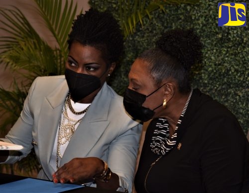 Culture, Gender, Entertainment and Sport Minister, Hon. Olivia Grange (right), speaks with National Director of the Entertainment, Culture and Creative Industries Council (Jamaica Creative), Marisa Benain, during the Jamaica Creative Internship awards ceremony, held recently at the AC Marriott Hotel in New Kingston.