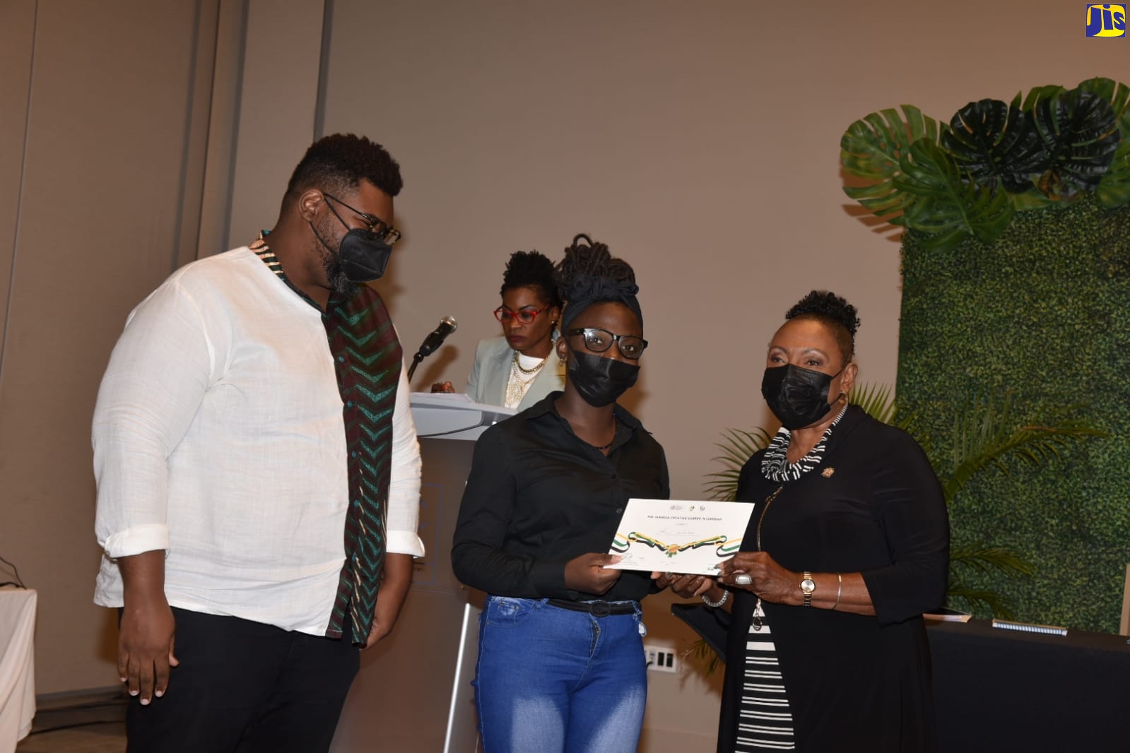 Culture, Gender, Entertainment and Sport Minister, Hon. Olivia Grange (right), makes a presentation to student at the Edna Manley College of the Visual and Performing Arts, Kiana Jackson, at the Jamaica Creative Internship awards ceremony held recently at the AC Marriott Hotel in New Kingston. Sharing the moment is Director, Events Management and Production, Jamaica Cultural Development Commission (JCDC), Gregory Simms (left). In the background is National Director of the Entertainment, Culture and Creative Industries Council (Jamaica Creative), Marisa Benain.