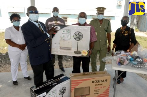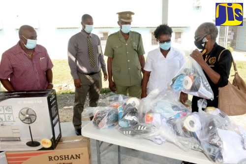 Superintendent B, Infirmary (Acting), Tamarind Farm Adult Correctional Centre, Michael Anderson (second right) accepts a gift from Justice of the Peace Cosmo Leroy Jowhill (third right) during the Justices of the Peace of Jamaica – Kingston Association – Christmas Care Packages Drive for inmates at the Tamarind Farm Adult Correctional Centre in Kingston on Thursday (Dec. 16). Also sharing in the moment (from left) are: registered nurse, Tamarind Farm Adult Correctional Centre, Corporal Nadine Chevannes; Acting Coordinator Medical Services, Tamarind Farm Adult Correctional Centre, Dr. Robert Hibbert; Superintendent A (Acting), Tamarind Farm Adult Correctional Centre, Glenford Clarke and Justice of the Peace, Cynthia Cooke. Photo: Dave Reid