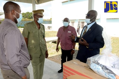 Acting Coordinator Medical Services, Tamarind Farm Adult Correctional Centre Dr. Robert Hibbert (left), Superintendent A (Acting), Tamarind Farm Adult Correctional Centre, Glenford Clarke (second left), Justice of the Peace, Cosmo Leroy Jowhill (second right) engages with Superintendent B, Infirmary (Acting), Tamarind Farm Adult Correctional Centre, Michael Anderson (right) during the Justices of the Peace of Jamaica – Kingston Association – Christmas Care Packages Drive for inmates at the Tamarind Farm Adult Correctional Centre in Kingston on Thursday (Dec. 16). Photo: Dave Reid