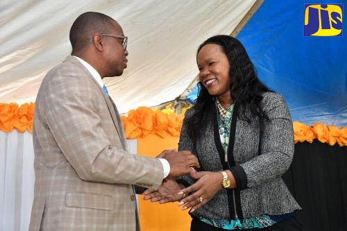 Permanent Secretary in the Ministry of Education, Skills, Youth and Information, Dr. Kasan Troupe, greets Principal of Guy’s Hill High School in St. Catherine, Cecil Donald, during the institution’s annual students’ awards ceremony on Thursday (November 28). The event was held at the school.