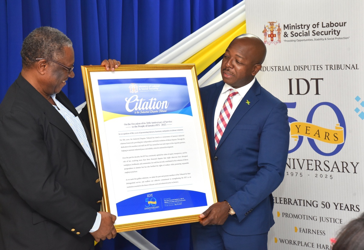A 50th anniversary commemorative plaque in recognition of the Industrial Disputes Tribunal’s (IDT) contribution to Jamaica’s labour relations framework, was unveiled by Minister of Labour and Social Security, Hon. Pearnel Charles Jr., on Thursday (May 29).