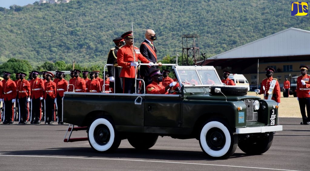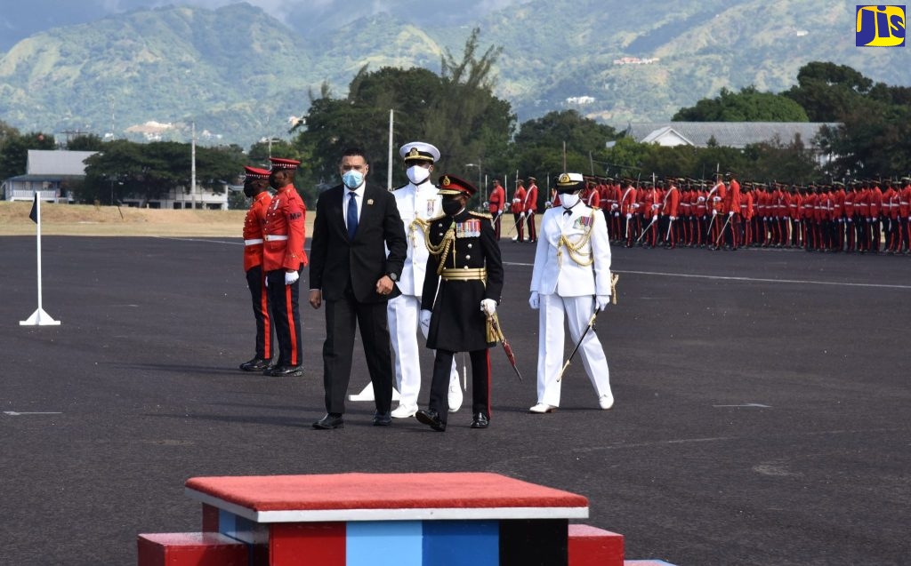 Prime Minister, the Most Hon. Andrew Holness, approaches the saluting dias to inspect the presentation of colours parade formed by members of the Jamaica Defence Force (JDF) at the Polo Field, Up Park Camp, on November 25. He is accompanied by Chief of Defence Staff, Lt. General Rocky Meade (second right).
