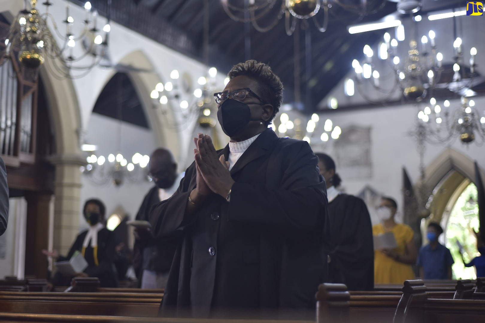 Director of Public Prosecutions, Paula Llewellyn, clasps her hands in prayer during the Annual Assize Church Service to mark the Opening Session of the Michaelmas Term of the Home Circuit Court, at the St. Andrew Parish Church on Sunday (October 24).