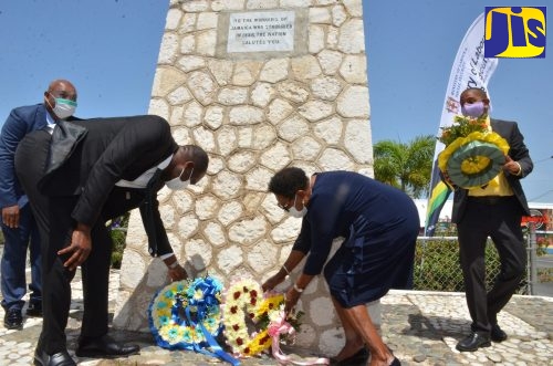 State Minister in the Ministry of Labour and Social Security, Hon. Zavia Mayne (second left) and Minister of Culture, Gender, Entertainment and Sport, Hon. Olivia Grange (second right), place wreaths at the Aggie Bernard Monument, Kingston Craft Market, downtown Kingston, on May 19, in recognition of National Workers’ Week/Labour Day. Workers’ Week is being observed under the theme ‘Together we rise, together we build and together we progress’, to pay tribute to Jamaican workers who participated in the 1938 Labour Riots, which led to improved working conditions for the workers of today. Waiting his turn at right is Mayor of Kingston, Senator Councillor Delroy Williams. At left is Deputy Mayor of Kingston, Councillor Winston Ennis.