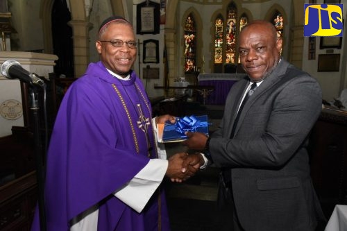 Commissioner of Mines and Geology, Roy Nicholson (right), accepts a token from Reverend Canon Sirrano Kitson at St. Andrew Parish Church in Kingston, during the 160th Anniversary Service for the Ministry of Transport and Mining’s Mines and Geology Division, on Sunday (March 31).