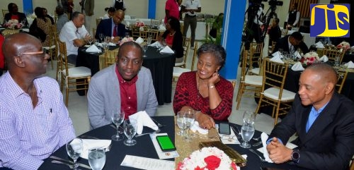 Minister of Local Government and Community Development, Hon. Desmond McKenzie (left), conversing with (from second left) Executive Director, National Solid Waste Management Authority, Audley Gordon; Chairman, Social Development Commission, Prudence Kidd-Deans; and Chairman, National Solid Waste Management Authority, Dennis Chung. Occasion was an appreciation luncheon for Board members of all affiliate agencies, hosted by Minister McKenzie at 60 Hagley Park Road in Kingston on December 19.
