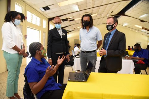 Minister of Education, Youth and Information, Hon. Fayval Williams (third left), listens as student at the Stony Hill HEART/NSTA campus in St. Andrew, Camille Newman (seated), highlights interesting aspects of the Coding Internship Programme in which she is enrolled. Ms. Willliams visited the institution recently, along with National Coordinator for the Housing, Opportunity, Production and Employment (HOPE) Programme, Lt. Col. Martin Rickman (right); and Chief Executive Officer (CEO), Amber Group, Dushyant Savadia (second right). Also pictured is Director-Principal, Stony Hill HEART/NSTA (Acting), Stacy-Ann Davis.