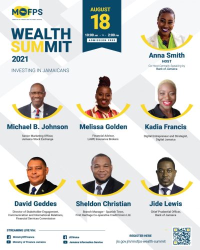 Six speakers are set to make up a stellar cast at the event beginning at 10:00 a.m. It will be live-streamed on the Facebook and YouTube sites of the Finance Ministry as well as the social media pages of the Jamaica Information Service. Registration is now open and persons can go to jis.gov.jm/mofps-wealth-summit/ to book their space.