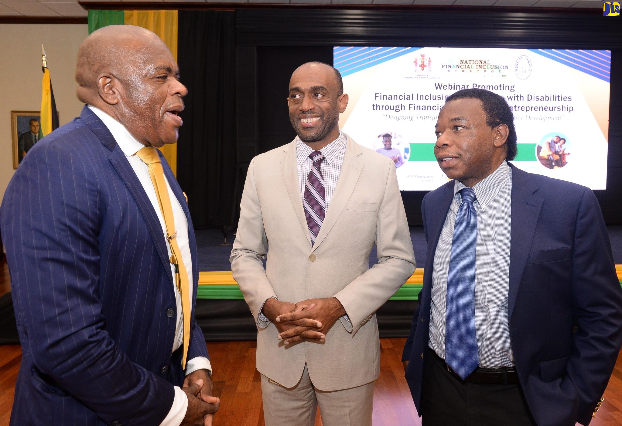Principal Director, Micro, Small and Medium-sized Enterprise (MSME) Division, Ministry of Industry, Investment and Commerce, Oral Shaw (right), engages with Senior Deputy Governor, Bank of Jamaica (BOJ), Dr. Wayne Robinson (centre) and Opposition Senator, Dr. Floyd Morris, during a hybrid webinar at the BOJ offices, downtown Kingston, on December 1.