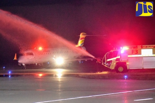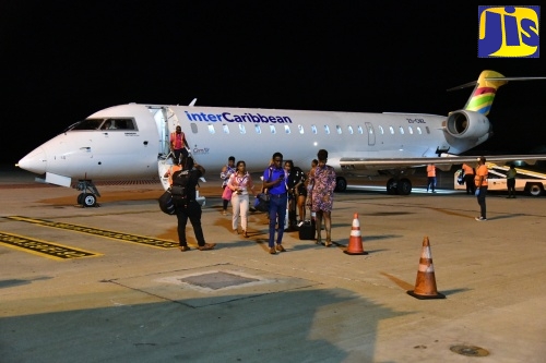 The traditional watercannon ceremony welcomes the inaugural InterCaribbean Airways flight from Bridgetown, Barbados to Norman Manley International Airport in Kingston on Tuesday night (February 6). InterCaribbean Airways will operate weekly non-stop flights between Bridgetown and Kingston on Mondays, Wednesdays, and Fridays, with return flights on Tuesdays, Thursdays, and Saturdays.Passengers disembark the InterCaribbean Airways CRJ700 Jet from Bridgetown, Barbados, which arrived at the Norman Manley International Airport on Tuesday (February 6). InterCaribbean Airways will offer weekly non-stop service between Bridgetown and Kingston.