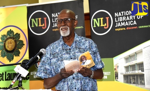 Professor Mervyn Morris, reads from a copy of his book entitled ‘Last Reel’ during a book launch held at the National Library of Jamaica in Kingston on Sunday (April 21).