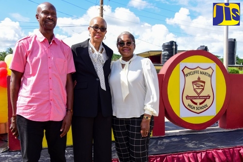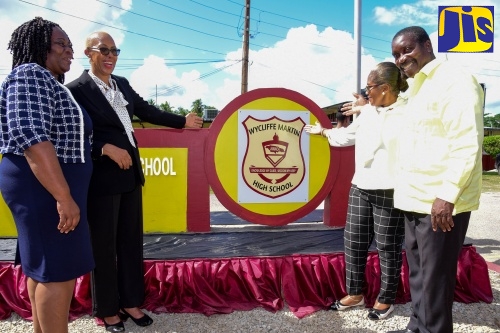 Minister of Education and Youth, Hon. Fayval Williams (second left), cuts the ribbon to symbolise the official renaming of the Brimmer Vale High School in Port Maria, St. Mary, to the Wycliffe Martin High School during a ceremony on November 30. Sharing in the moment (from left) are Principal, Evorine Henry Tracey; and Member of Parliament for St. Mary Western, Robert Montague. Wycliffe Martin became Member of Parliament for St. Mary Central in 1962, and made significant contributions to the development of the constituency and the parish.