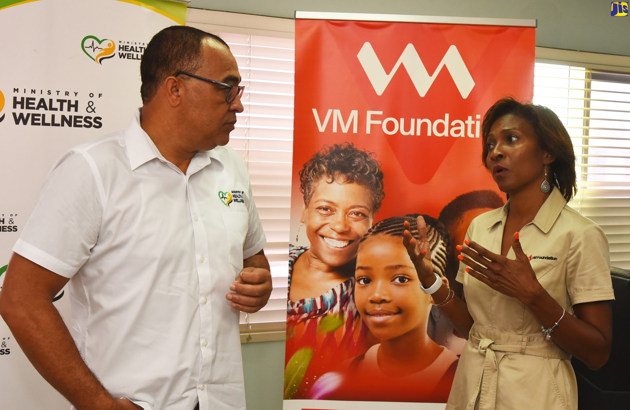 Minister of Health and Wellness, Dr. the Hon. Christopher Tufton (left), conversing with Chief Executive Officer, Victoria Mutual (VM) Foundation, Samantha Charles, following the recent contract signing with VM Foundation for the three-year renewal agreement for the adoption of the St. Jago Health Centre in St. Catherine, under the Ministry’s Adopt-A-Clinic Programme. The ceremony was held at the Ministry’s New Kingston offices.
