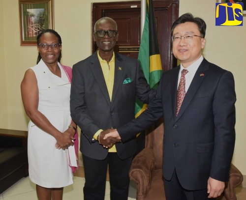 Minister of Local Government and Community Development, Hon. Desmond McKenzie (centre) exchanges greetings with Ambassador of the People’s Republic of China to Jamaica, His Excellency Wang Jinfeng, during a recent courtesy call at the Ministry’s offices on Hagley Park Road in Kingston. Also present was Permanent Secretary, Marsha Henry-Martin.