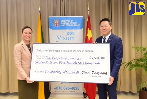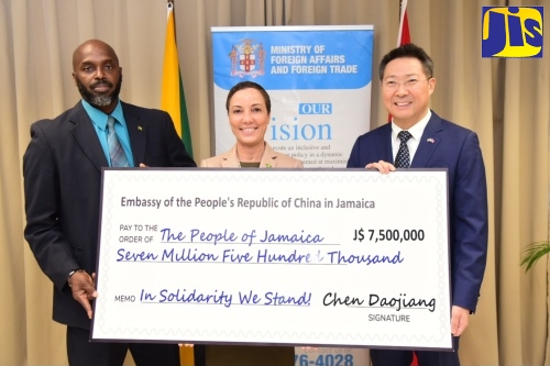Minister of Foreign Affairs and Foreign Trade, Senator the Hon. Kamina Johnson Smith (centre), and Acting Director General of the Office of Disaster Preparedness and Emergency Management (ODPEM), Richard Thompson (left), receive a cheque valued at $7.5 million from Chinese Ambassador to Jamaica, Chen Daojiang, to assist Jamaica’s Hurricane Beryl recovery efforts. The handover ceremony was held at the Ministry’s offices in downtown Kingston on Tuesday (July 16).Minister of Foreign Affairs and Foreign Trade, Senator the Hon. Kamina Johnson Smith (left), accepts a cheque valued at $7.5 million from Chinese Ambassador to Jamaica, Chen Daojiang, during a handover ceremony held at the Ministry’s offices in downtown Kingston on Tuesday (July 16). The funds will go towards the Jamaica’s Hurricane Beryl recovery efforts.