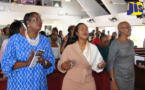 Minister of Education and Youth, Hon. Fayval Williams (right); Permanent Secretary in the Ministry, Dr. Kasan Troupe (centre); and Chief Education Officer, Terry-Ann Thomas-Gayle, worship at the Webster Memorial United Church in St. Andrew on Sunday (April 14), to launch Mathematics Week.