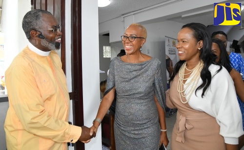 Minister of Education and Youth, Hon. Fayval Williams (centre); is greeted by Associate Minister at the Webster Memorial United Church, Rev. Delroy Harris, on arrival at the church on Half-Way-Tree Road, St. Andrew on Sunday (April 14), for the Mathematics Week Church Service. Looking on is Permanent Secretary in the Ministry, Dr. Kasan Troupe.