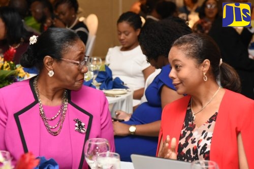 Attorney General, Hon. Marlene Malahoo Forte (right), converses with Custos of St. Andrew, Dr. Patricia Dunwell (left), at a commissioning ceremony for Justices of the Peace for the parish at The Jamaica Pegasus hotel in New Kingston on Sunday (February 16).