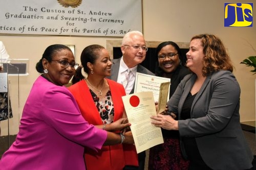 Minister of Justice, Hon. Delroy Chuck (centre); and Attorney General, Hon. Marlene Malahoo Forte (second left), look on as Custos of St. Andrew, Dr. Patricia Dunwell (left), presents Kristina Chuck Smith (right) with her instument of appointment, at a ceremony to commission new Justices of the Peace for St. Andrew, held at The Jamaica Pegasus hotel in New Kingston on Sunday (February 16). Also sharing in the moment is Director and Principal of the Justice Training Institute (JTI), Karen Campbell-Bascoe.