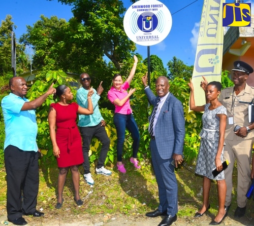 Member of Parliament for Portland Eastern, Ann-Marie Vaz (centre), and Chief Executive Officer of the Universal Service Fund (USF), Dr. Daniel Dawes (third right), celebrate the launch of community Wi-Fi in Sherwood Forest in the constituency on November 30. Sharing the moment are (from left) Deputy Chairman of Sherwood Forest Primary School, Sydney Moore; Drapers Primary School Teacher, Comlin Henry; Councillor Caretaker, Portland Eastern, Athlee Cleary; Senior Teacher, Sherwood Forest Primary School, Monique Thomas; and Superintendent of Police, Lloyd Darby. The USF brought free and safe community Wi-Fi to both Sherwood Forest and Manchioneal on the day.