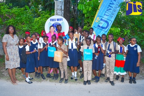 Chief Executive Officer of the Universal Service Fund (USF), Dr. Daniel Dawes (fifth left); and Member of Parliament for Portland Eastern, Ann-Marie Vaz (centre), are surrounded by students and teachers from the Sherwood Forest Primary School, during the launch of Wi-Fi service in the Portland-based community on November 30.