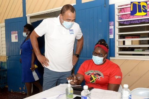 Minister of Health and Wellness, Dr. the Hon. Christopher Tufton, observes as Community Health Aide at the Gordon Town Health Centre in St. Andrew, Stephanie Hall, uses her tablet to access the online coronavirus (COVID-19) registration system, during a vaccination blitz at the Bellevue Hospital in Kingston on Wednesday (October 13). More than 300 long-stay patients were slated to be vaccinated.