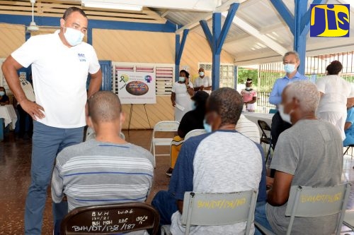 Minister of Health and Wellness, Dr. the Hon. Christopher Tufton (left), converses with patients at the Bellevue Hospital in Kingston, during a coronavirus (COVID-19) vaccination blitz at the institution on Wednesday (October 13). More than 300 long-stay patients were slated to be vaccinated.