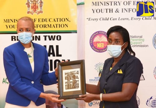 Minister of Education, Youth and Information, Hon. Fayval Williams (left), receives a craft item made by a student of Lyssons Centre of Excellence from one of the school’s teachers, Merva Watson, on Wednesday (December 16). Occasion was the opening of the newly renovated Pear Tree River Special Needs School, formerly called Pear Tree Primary, in St. Thomas.