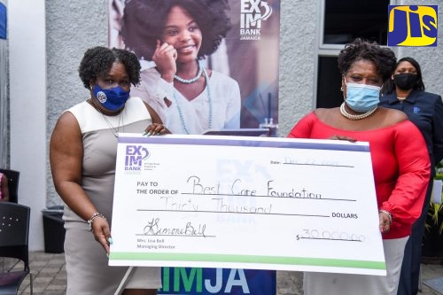 Managing Director of the National Export-Import Bank of Jamaica (EXIM Bank), Lisa Bell (right), presents a cheque for $30,000 to Principal of the Best Care Special Education School, Sharita Brock-Lewin, towards the institution’s annual fundraiser, the proceeds of which are used to replenish supplies and sustain operations. The presentation was made during EXIM Bank’s ‘Carolling in the Courtyard’ event on Tuesday (December 22) at the entity’s head office on Hope Road in Kingston.
