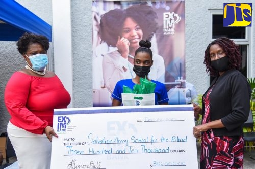 Managing Director of the National Export-Import Bank of Jamaica (EXIM Bank), Lisa Bell (left), presents a cheque for $310,000 to Vice Principal of The Salvation Army School for the Blind and Visually Impaired, Sherine Gordon (right), during the Bank’s ‘Carolling in the Courtyard’ event on Tuesday (December 11). The event was held at EXIM Bank’s head office on Hope Road in Kingston. Five tablets, each with one year’s supply of data, were also given to several students from the institution. The donation was made through the EXIM Bank’s philanthropic arm, in keeping with its Corporate Social Responsibility. Sharing in the moment is student at the School, Sherika Nesbeth.