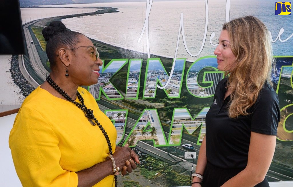 Minister of Culture, Gender, Entertainment and Sport, Hon. Olivia Grange (left) shares in conversation with Senior Trophy Tour Manager, FIFA, Sarah Gandoin, following the arrival of the FIFA Women’s World Cup Trophy at the Norman Manley International Airport in Kingston on April 16.