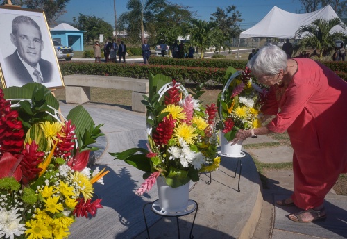 Mrs. Glynne Manley, widow of late former Prime Minister, Most Hon. Michael Manley, lays a floral arrangement at his shrine at National Heroes Park in Kingston on December 10, to commemorate the 101st anniversary of his birth. Mrs. Manley was joined by dignitaries and other family members in honouring the legacy of Mr. Manley, who was born on December 10, 1924, and died on March 6, 1997.