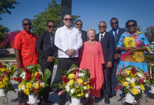 Mrs. Glynne Manley (fourth right), widow of late former Prime Minister, Most Hon. Michael Manley (fourth right) and Mr. Manley’s son, Joseph (third right), are joined by dignitaries at a floral tribute to mark the 101st anniversary of Mr. Manley’s birth at National Heroes Park in Kingston on December 10. From left are Mayor of Kingston, Councillor Andrew Swaby; General Secretary of the National Workers Union (NWU), Granville Valentine; President of the Senate, Senator the Hon. Thomas Tavares-Finson; State Minister in the Ministry of Labour and Social Security, Hon. Donovan Williams; Supernumerary Permanent Secretary, Ministry of Culture, Gender, Entertainment and Sport, Dean-Roy Bernard; and representing the Leader of the Opposition, Member of Parliament for St. Andrew South Western, Dr. Angela Brown- Burke.